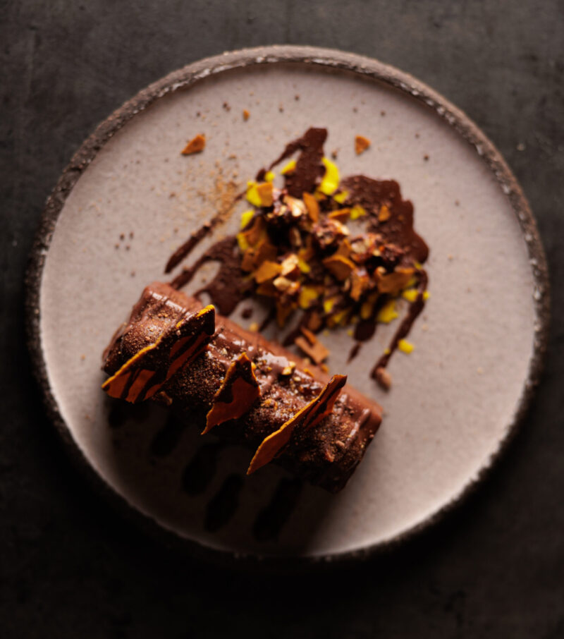 Belgian dark chocolate ganache, caramelized chocolate soil, burnt meringue, handmade milk ice cream