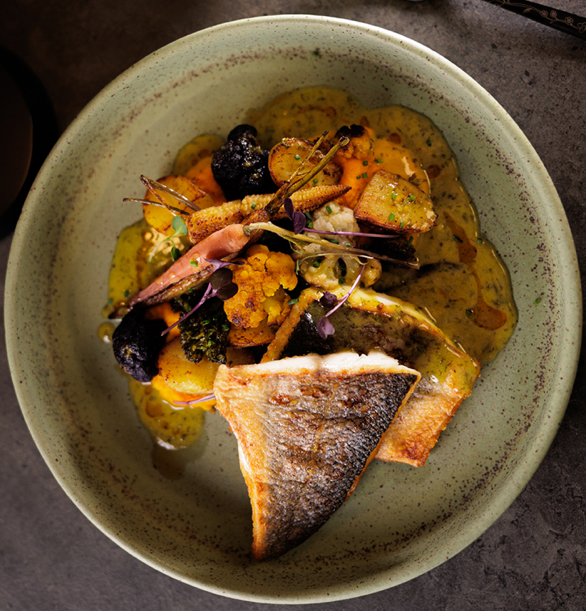 Served over creamy potato purée, with charred seasonal greens, Savoro sauce, plump raisins, and a drizzle of fragrant dill oil.