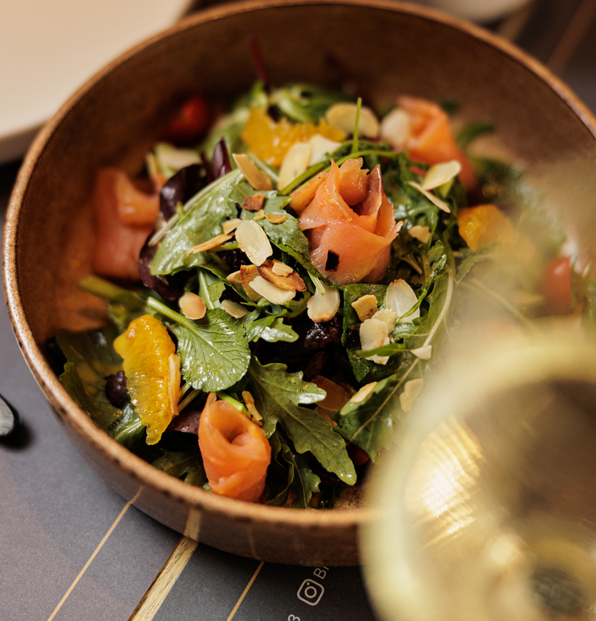 Charred kale, beetroot, carrot, fresh onion, burrata cheese, walnuts, mustard seeds vinaigrette.
