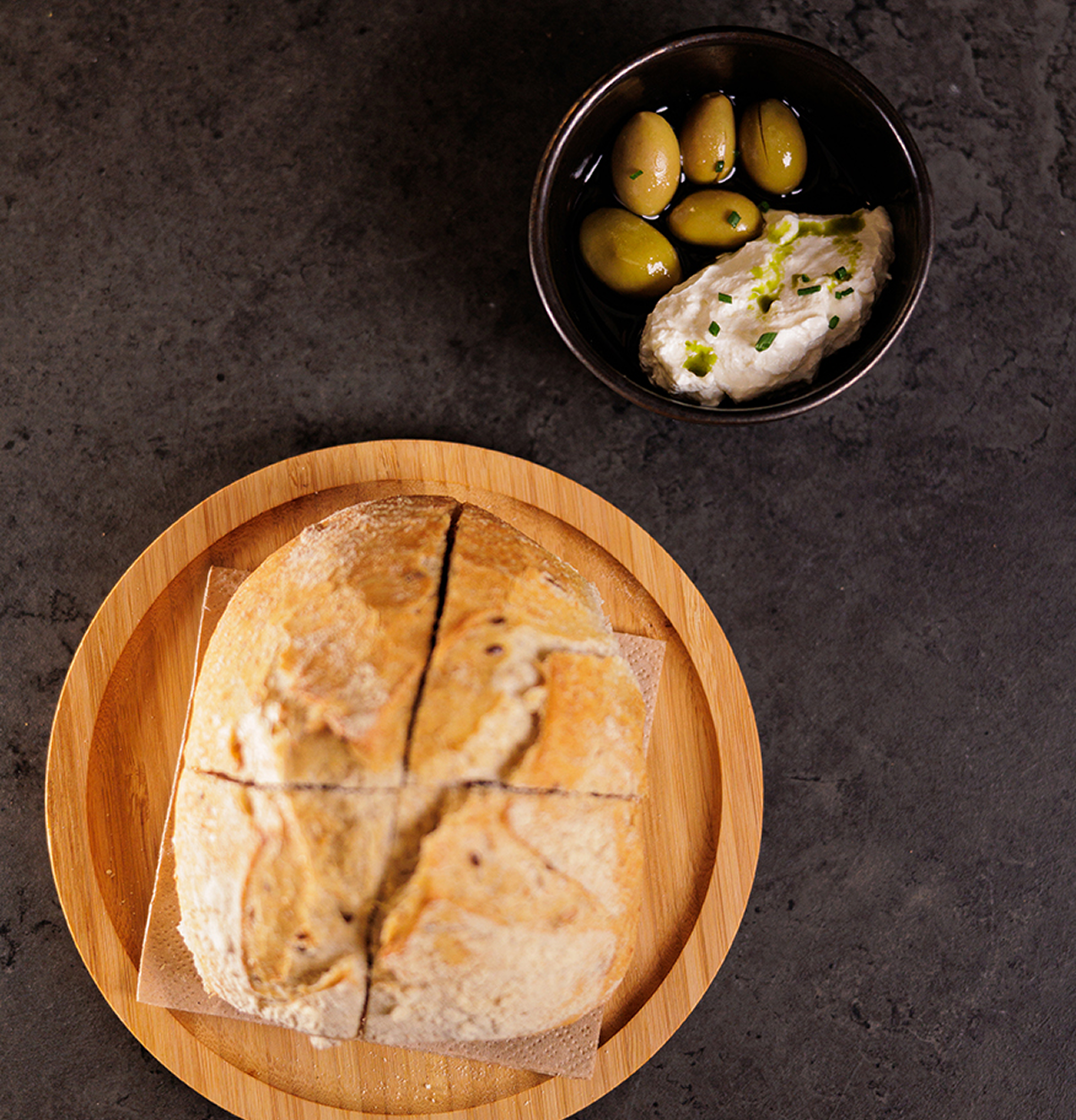 Handmade long maturation sourdough bread, handmade galotyri & green olives.