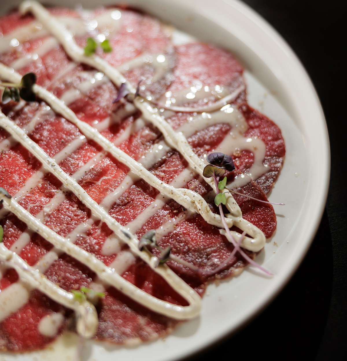 Marinated grouper or scorpaena fillet carpaccio, “Corfiot burdeto” mayonnaise, lemon cream potato crumble with paprika, lemon oil.